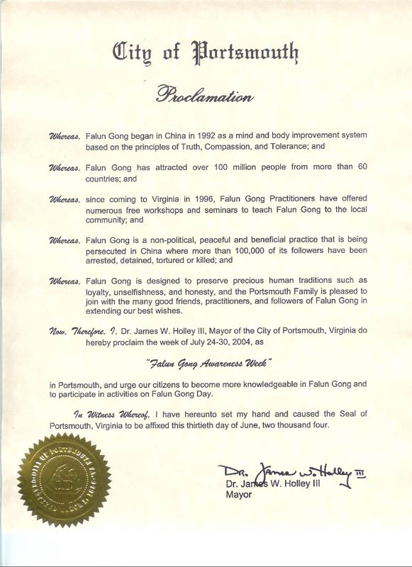 所以,现在,维吉尼亚州朴次茅斯市市长詹姆斯ܧ赫利博士,在此宣布2004年7月24日至30日为朴次茅斯市“法轮功认知周”,希望我们的市民進一步了解法轮功并参与法轮功日的活动。