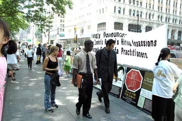 随着中国大陆法轮功学员遭残酷迫害的消息越来越多,纽约法轮功学员多次以领馆前静坐请愿,递交请愿书,召开记者会等多种方式表达强烈关切,但始终得不到领馆方面的任何正面回应。相反,法轮功学员的发言人张而平先生多次受到电话恐吓。在天安门自焚案被炮制出来不久,张而平先生因向媒体揭露事实真象,受到来自一位华人男子的死亡恐吓电话。