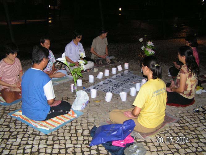 7月20日虽然不是假期,大法弟子们利用午间休息时间在澳门著名的旅游景地大三巴派发真象资料,向大陆游客和本地市民讲述法轮功被迫害的真象。晚上在中联办对面的小花园里举行烛光守夜,悼念99年7.20以来被迫害致死的大法弟子,抗议江氏流氓集团的国家恐怖主义罪行,呼吁停止迫害法轮功。
