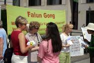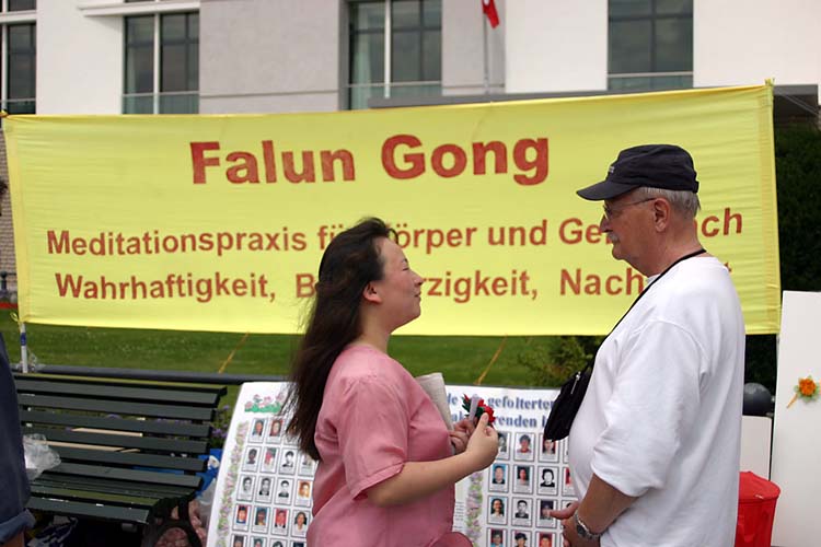 一位年长的德国女士在看过图片后,走到我们的桌边,索取更多的真象资料,她说她立即要将真象资料送给她的牧师朋友,请求她在明天作礼拜时为受迫害的法轮功学员祷告。她还要了一份中文资料,说要将真象告知她的一位中国朋友。酷刑图片让她太震惊,显得有些激动,她不停地指着图片告诉其他人“这完全是纳粹方式”。平静后她向学员要了两朵自制的莲花,表示要为所有被迫害致死的和正在受迫害的学员祈祷。