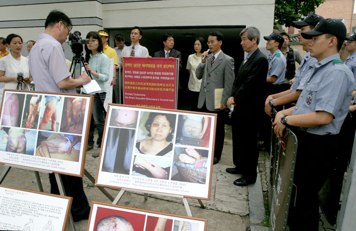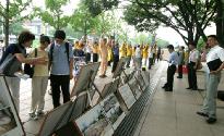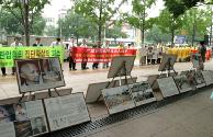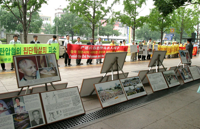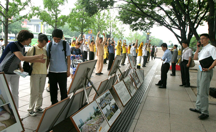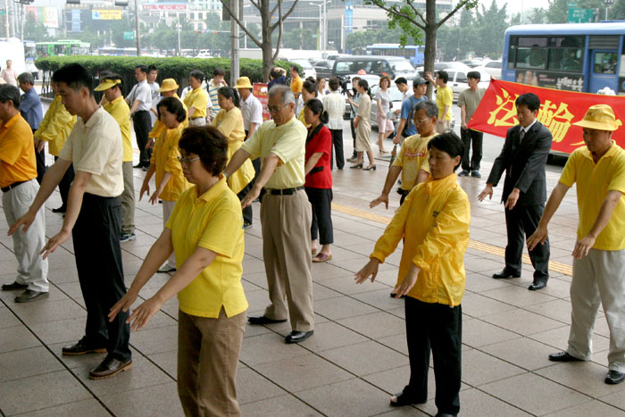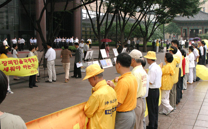 学员们肃穆地朗读了对被迫害致死的法轮功学员的悼词,之后又对法轮大法及5年来的镇压过程作了详细说明。其间连警察们都关心的仔细聆听。“声明书”由韩国和华人学员分别用韩文及中文進行朗读,扬声器把这坚定的声音传到了对面的中国大使馆。在记者招待会上,记者们详细采访了就法轮大法遭受镇压5年之际,韩国大法学会的立场及大法在中国遭受迫害的实际情况。
