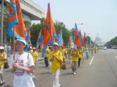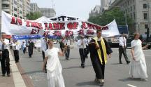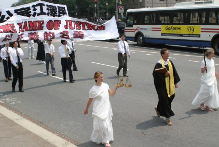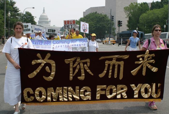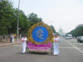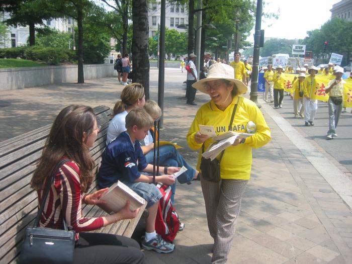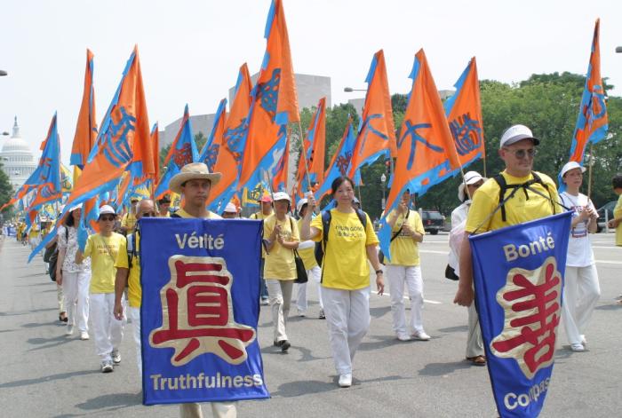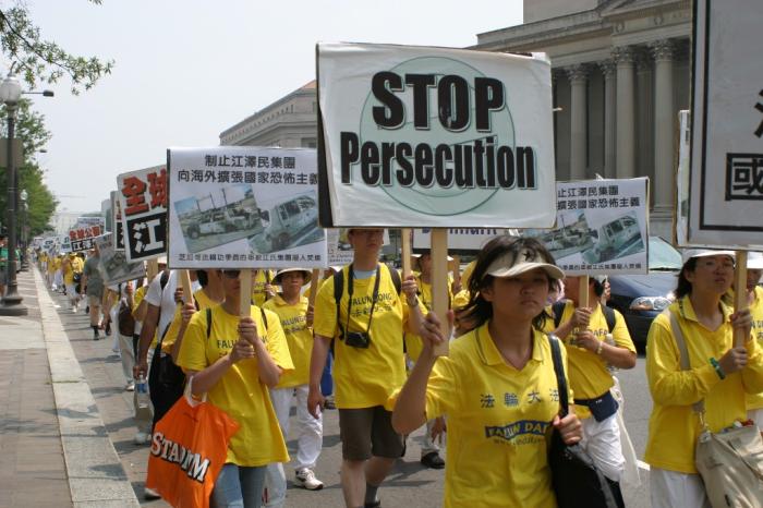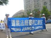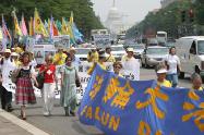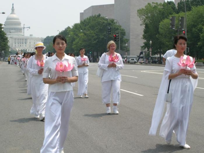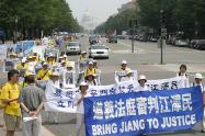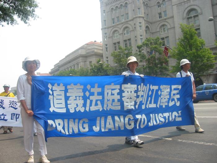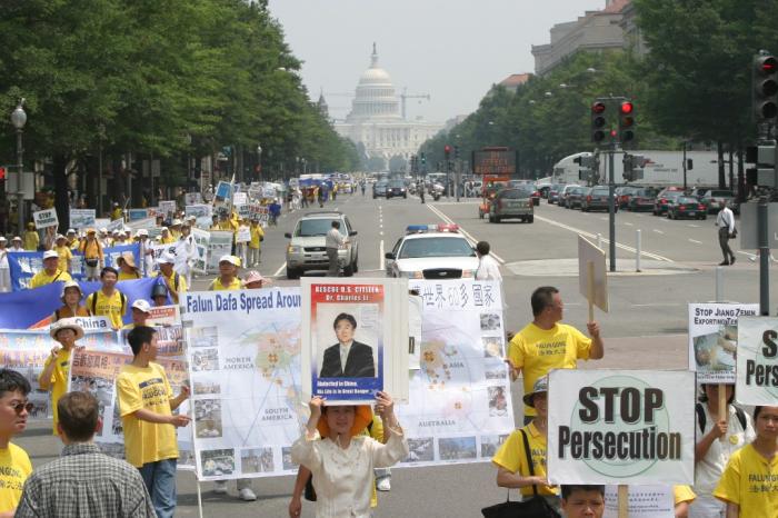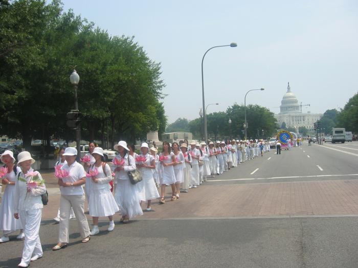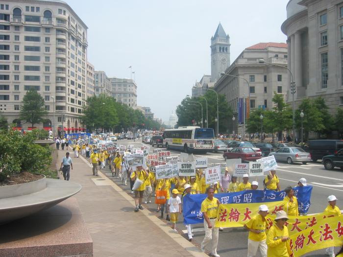 集会结束后,法轮功学员从国会西草坪出发,游行到白宫前。几乎每位法轮功学员都举着横幅或者展板,上面写着“法轮大法好”,“真善忍”,“停止迫害”,“全球公审江泽民”,“制止江泽民集团海外扩张国家恐怖主义”,等等字样。