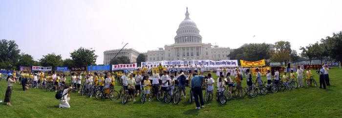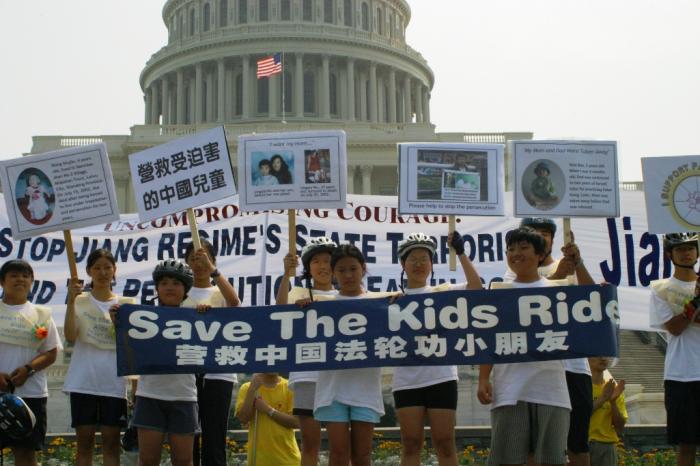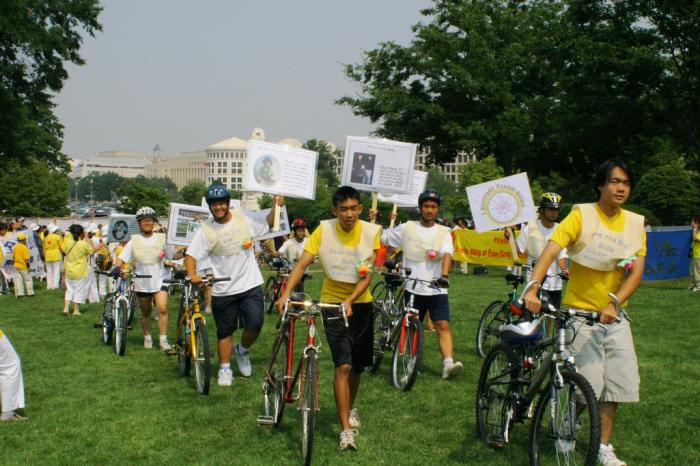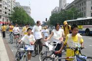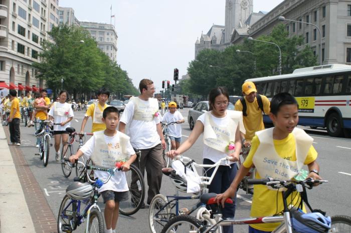 为揭露江氏集团对修炼法轮功的儿童的迫害,一队加拿大青少年,从多伦多骑自行车到华盛顿特区,全程约有一千二百公里,共计二十三天,于7月22日抵达华府,邀华府民众与青少年7月22日参加“营救中国受迫害儿童脚踏车游行”。华府民众、青少年,在马里兰州与DC交界的Chevy Chase Circle 公园内与他们会合,進行了长达十三公里的“营救中国受迫害儿童脚踏车游行”,为华盛顿DC 7.20系列活动揭开序幕。