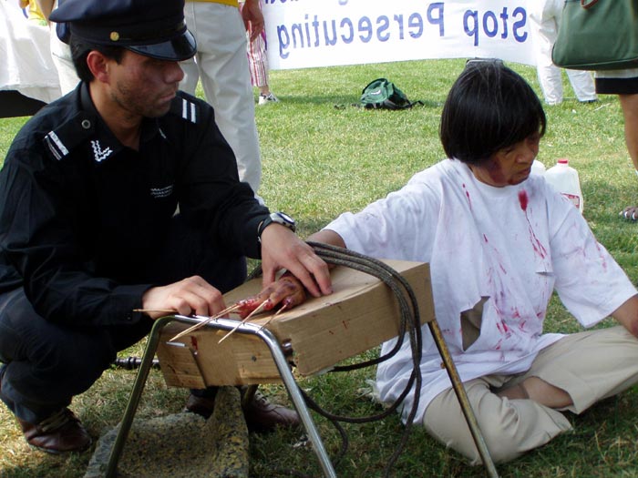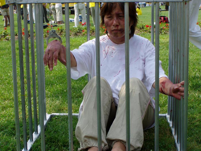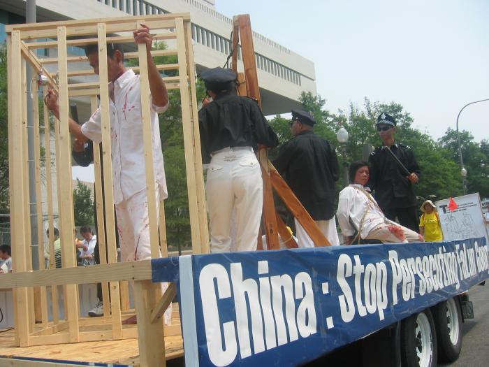 在队伍的中间,有一辆演示酷刑的车子,演示法轮功学员在中国大陆遭受的残酷迫害。几位祥和慈善的法轮功学员,几个荷枪实弹、虎视眈眈的警察。场面震撼人心。