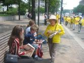 7月22日早上,这个大约有130辆的脚踏车游行,在警察的护卫引导下,骑往中国大使馆举行新闻发布会,并且递交请愿信,要求中国的驻外单位能够代为转达所有来自世界六十几个国家的法轮功学员希望停止对法轮功迫害的心声。