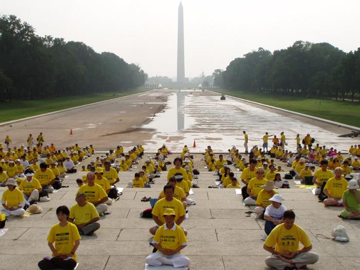 ![]() 法轮功学员DC林肯纪念堂前炼功 | ![]() 西人法轮功学员炼功照 |