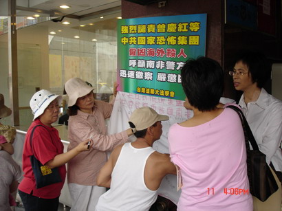 台湾法轮功学员希望能藉由揭露江氏集团这一雇凶杀人的恐怖行为,让民众更看清江氏流氓集团的野蛮行为。同时2004年7月17日在中正纪念堂瞻仰大道举行烛光悼念7.20活动,以数千支烛光表达追思与敬佩为信仰真理的失去生命的法轮功学员外,更以真人演示十一种法轮功学员在中国遭受的酷刑工具,唤醒全世界人心底的善念,站出来谴责这场残酷迫害,共同制止与早日结束这惨无人道的暴力行为。