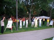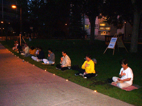 首先全体学员集体炼功,然后在9点左右大家点燃了一枝枝蜡烛,在路边摆成长长的一行,这烛光象征着对在中国为坚持信仰真理而献身的同修的悼念,也象征着黑暗中指引我们的永不磨灭的法光,更象征着五年看似平凡却无比辉煌的正法之路。有过往行人驻足观看,学员与他们交谈讲真象。