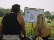 国会山的游客观看法轮功学员在中国大陆受到迫害的展览