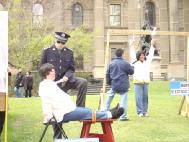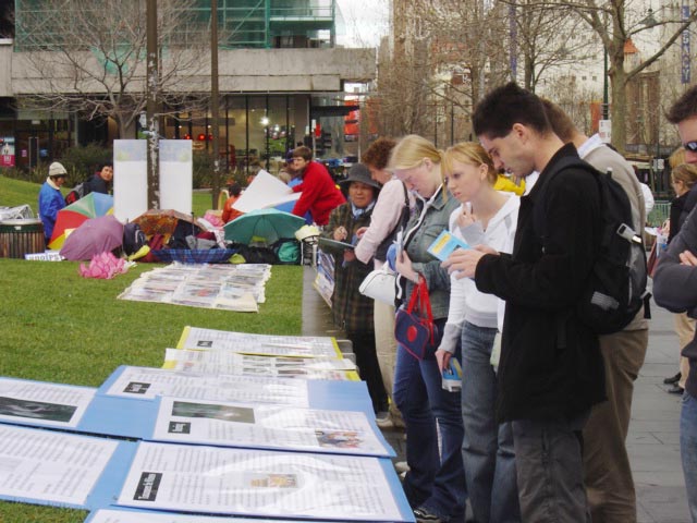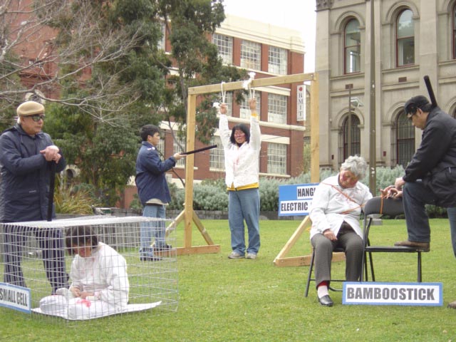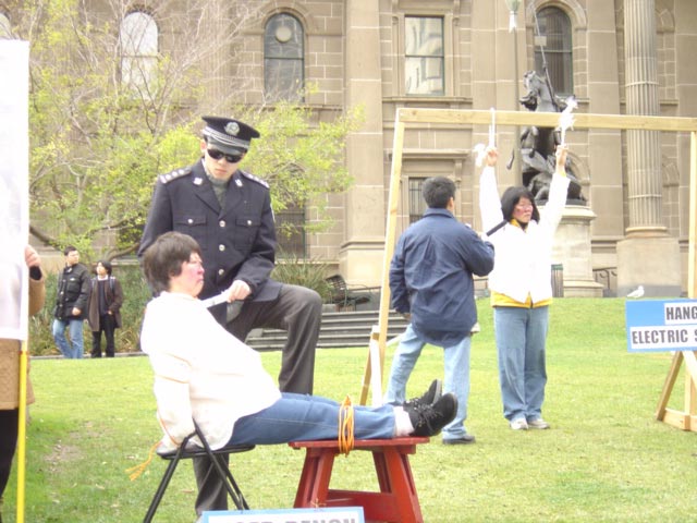酷刑一隅行人关注维多利亚州图书馆位于市区主街Swanston St 和 Latrobe St 的交汇处,每逢周末总会有络绎不绝来此参观阅览的人们;两街间还不断的穿梭着周末休闲逛街的人们。法轮功学员所展示给行人的场面让来往匆匆的人群放慢了脚步,注视着眼前发生的这一切。十多种在中国大陆被用于迫害法轮功学员的酷刑被淋漓尽致的以图片、照片和文字说明形式展现在酷刑展牌上:钉死板、别扭扣双手、强制灌食、冷热窒息、压刑、囚笼、烧烫、钉竹签、坐、吊刑、强制定位和电击等;真人拟实演示更加引人关注。人们在震惊于信仰“真善忍”的法轮功学员所遭受的无人性的迫害的同时,也在不解的向学员询问为什么江××要发动这场迫害。学员们耐心细致的向他们说明了这场迫害的真象。其中一名学员说:“江××发动了迫害是因为它是个无视人民疾苦只重自我权力的妒嫉心极强的独裁暴君”。学员们还向关心的人们進一步讲述了江氏集团的这种国家恐怖主义扩张到海外的事例,并着重介绍了江氏集团雇凶杀人的南非枪击案。
