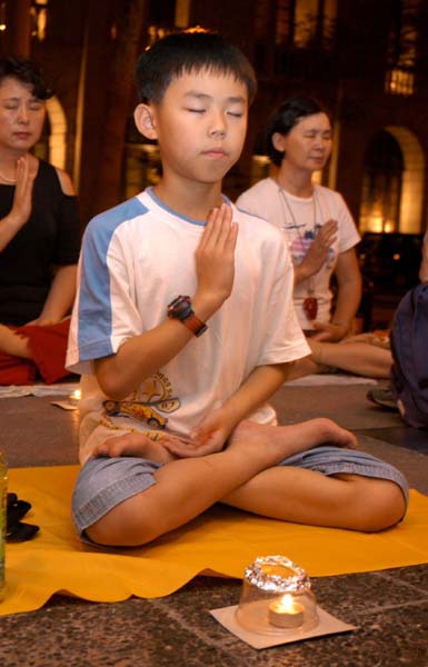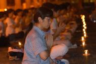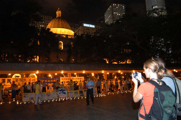致死的上千名法轮功学员。当天晚上,二百多名香港法轮功学员在中环遮打花园燃起点点烛光,纪念那些为坚持信仰“真善忍”而牺牲生命的同修。