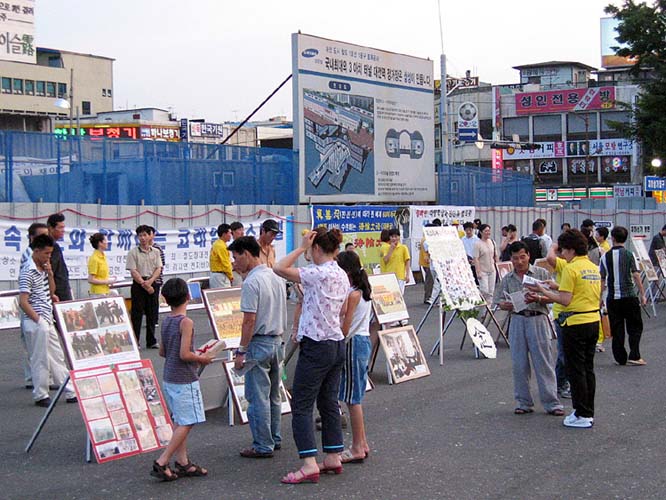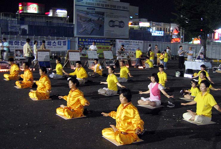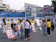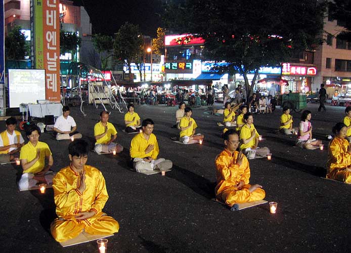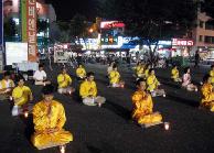 此次活动于傍晚7时许开始,与白天相比傍晚有更多的市民在广场上往来。学员们就在此中集体演示了五套功法。而旨在揭露中国迫害的图片展以及大赦国际呼吁停止镇压法轮功的影像放映活动也一并举行。最后,学员们用星星点点的烛光共同悼念了那些不屈的大法弟子。