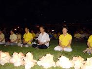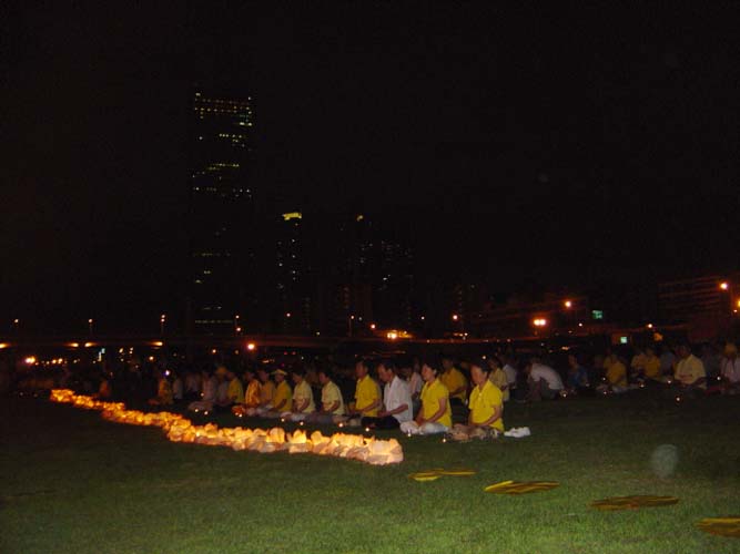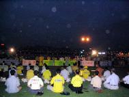 之后部分法轮功学员排成“正法”二字,整个场面庄严肃穆。在默哀三分钟后,主持人宣读了开幕词“请点一支蜡烛”,开幕词中说:“他们用真诚面对谎言,用善良抑制邪恶,用宽容和忍耐对待暴力和虐待,启迪着人们的良知和善念,引导着人们回归‘真善忍’之路。”
