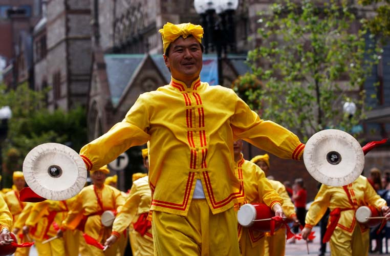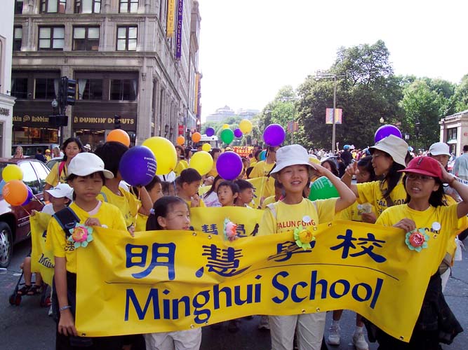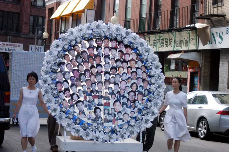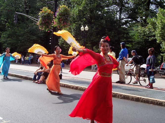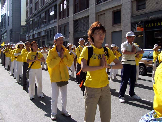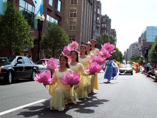 队伍以喜庆的舞龙、舞狮开路,百人炼功队为观众演示了五套功法;学员还表演了精彩的唐装舞、仙女舞、民间腰鼓等。另外学员也在平板车上真人演示了在中国大陆正在发生的对法轮功学员的部分酷刑。数十位女学员身着白衣裤、手捧花圈,以表达对在大陆因不愿放弃“真、善、忍”而被折磨致死的同修的悼念。并打出“全球公审江××”的横幅,呼吁共同制止迫害。