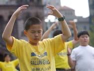 ![]() 绚丽多彩的扇子舞 | ![]() 天真快乐的明慧学校的学生 | ![]() 孩子们在示范功法 |