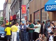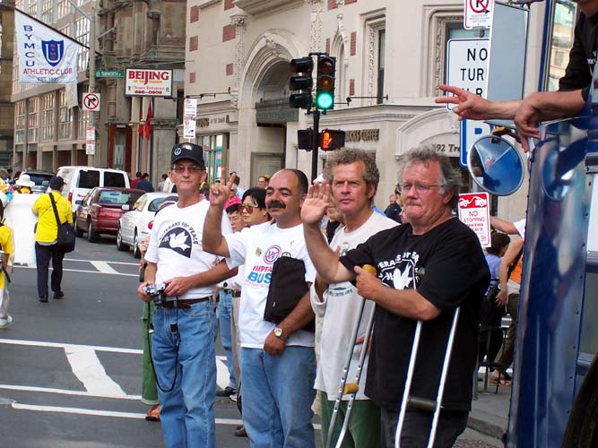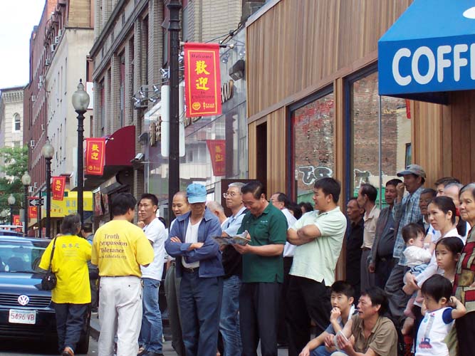 当队伍经过中国城时,不少社区侨领出来观看游行。有的人不断赞叹队伍真的壮观;并对学员说,你们为华人争了光。有的问,今天是什么节日,如此特殊。有的主动索取真象资料并与学员交谈。