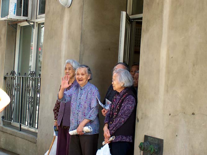有几位老人在观看游行时,一边向学员挥手,一边说,“法轮大法好。”