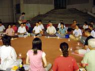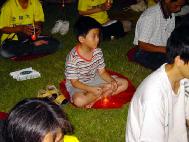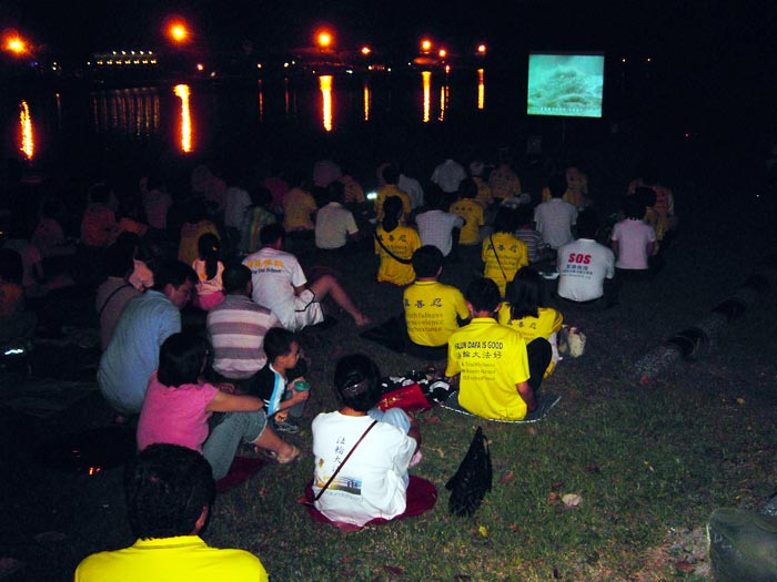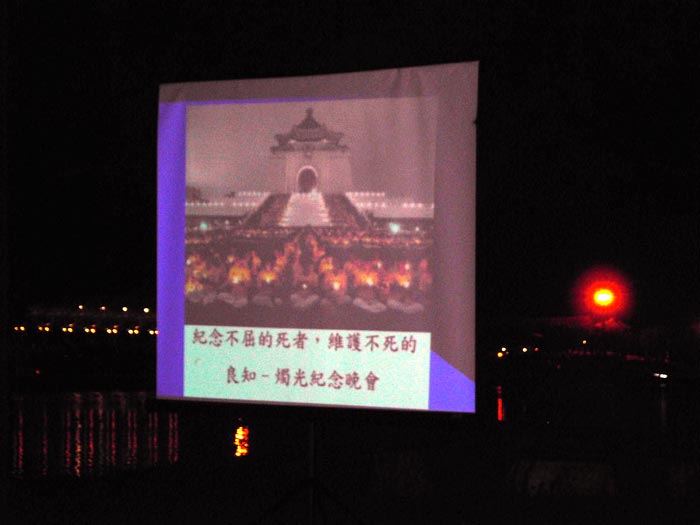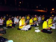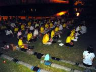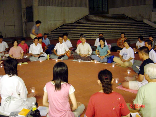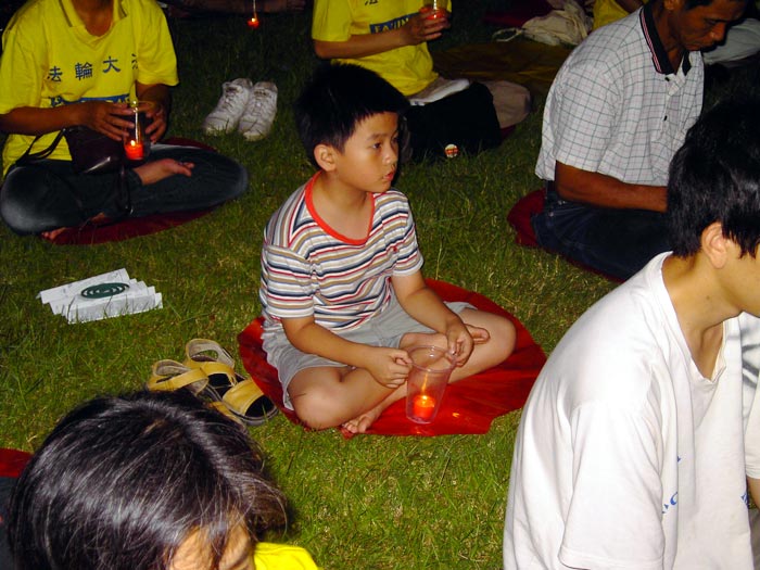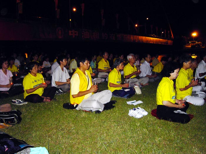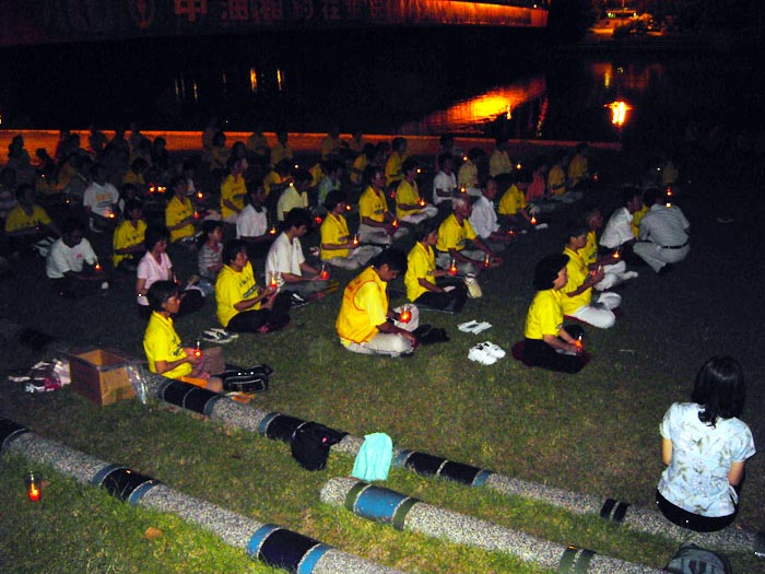 2004年7月23日晚;当夜幕悄悄的降临,在全台湾知名的冬山河亲水公园里,正是歌舞喧腾,欢乐四处洋溢之时。然而,在一衣带水的对岸边上,百余名宜兰法轮功学员却是默默的坐在草地上,双手捧著一支点燃的蜡烛,专注的守护手中那一盏烛光,肃穆的悼念一千多位在中国大陆遭受迫害致死的法轮功学员。