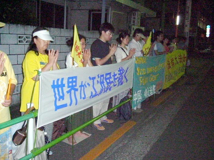 76岁的旅日华人鲁老先生得知当天傍晚开始的这次活动,很早就赶到现场,表示要支持法轮功学员的正义行动,大力向社会揭露江氏灭绝人性的残暴。