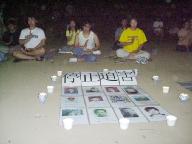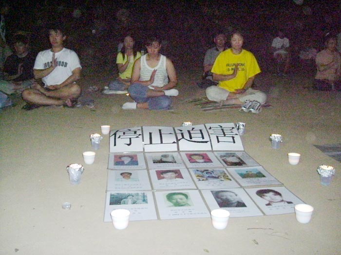 公园里参加烛光守夜的弟子,和大使馆前大法弟子同步发正念,并轮流朗读赞颂死难同修的诗歌,朵朵烛花,辉映着死难同修的照片,送去我们的无尽哀思。公审江泽民的横幅,更表达出我们揭露恶首罪孽,救度众生的坚定决心。