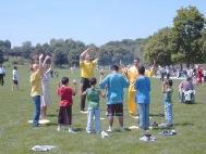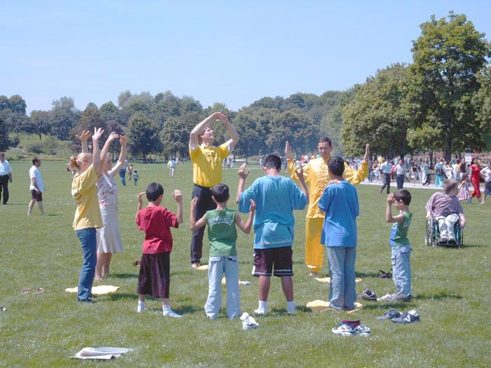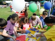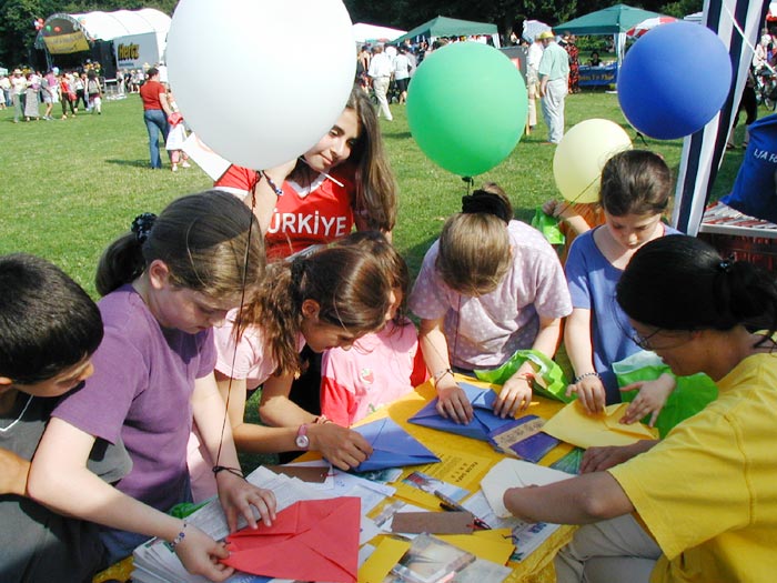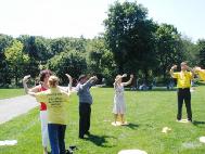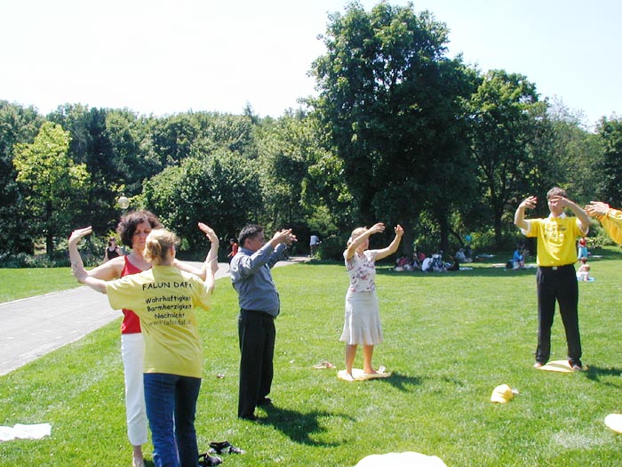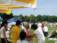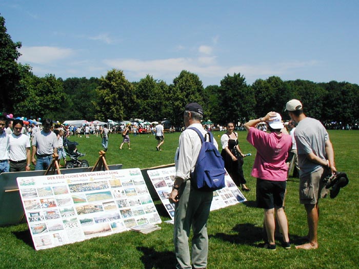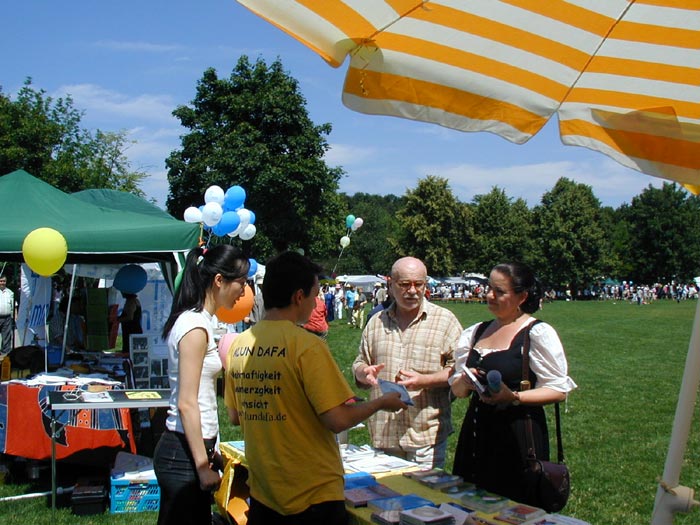 慕尼黑的大法弟子也申请到一个摊位,许多人对大法书籍、介绍法轮功和迫害真象的资料很感兴趣,人们仔细的观看了法轮功的展板,有不少人跟着学炼功法,流露出人们对大法的渴望。很多小朋友们很喜欢纸叠的莲花,他们兴致勃勃的跟着学员学做莲花,并了解到许多在中国大陆,有许多和他们一样的孩子因为自己和家人信仰“真善忍”而家破人亡,流离失所,这一朵朵莲花正是象征着法轮功修炼者对信仰的坚贞和高尚的情操。