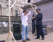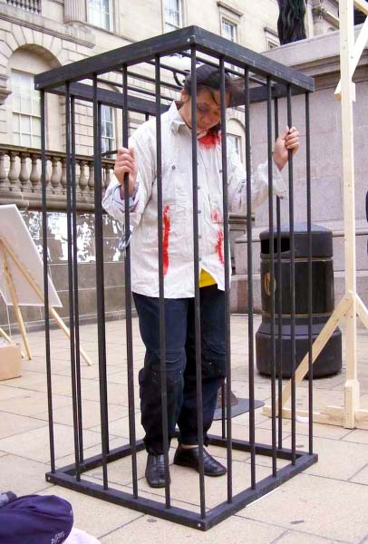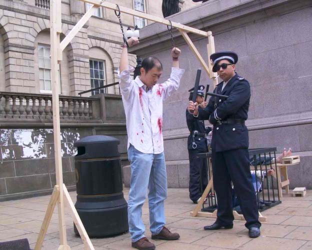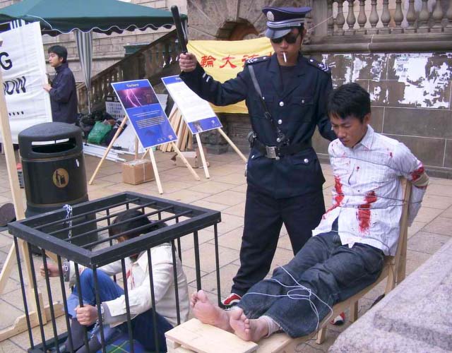 24日的天气格外的反常,先是狂风,然后是阵雨,大法弟子就在凄风暴雨中拉开了酷刑展的序幕。狂风使展板无法全部展出而且不断吹落征签台上的传单和征签表,阵雨打湿了学员身上的单衣。所有参加这次活动的学员没有一个为之所动。大家用正念相互鼓励,配合默契。一边是老虎凳,“大挂”,地笼等一件件刑具和身着“血衣”、带有“伤痕和血迹的”的法轮功学员,另一边是几名学员随着音乐展示功法。两位学员端坐在征签台与酷刑展之间发正念清除另外空间的邪恶因素。两面写有“立刻停止对法轮功五年的迫害”和“这,正在中国发生着”的横幅格外醒目,负责解说的学员一遍遍的向过往路人诉说着大法弟子正在中国遭受着的不公正的非法待遇,呼吁善良的人们支持“真善忍”,站出来共同制止这场迫害。