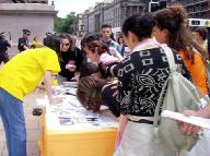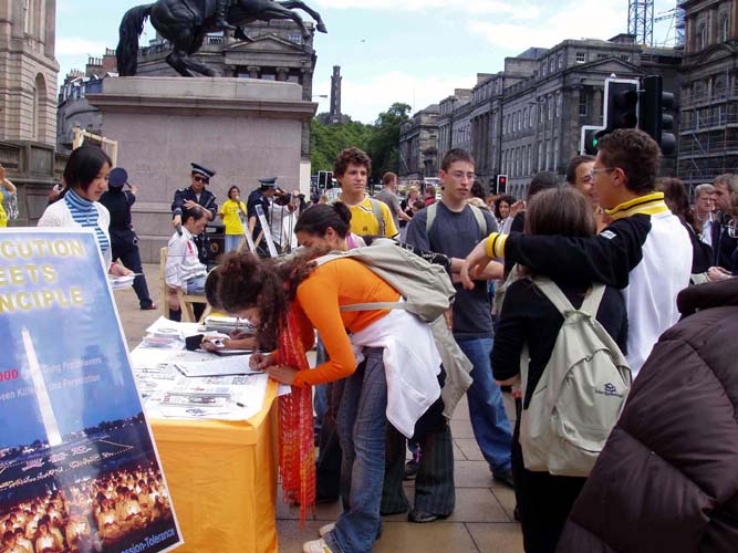 周末的爱丁堡街头,人头攒动,天气的原因使得人们行色匆匆。但从来只从电视报纸上才看到的血淋淋的酷刑和优美、舒缓的五套功法使不少人停住了脚步。听了学员们的解说,善良的苏格兰人震惊了!爱丁堡震惊了!人们不敢相信如此惨烈的迫害竟然发生在二十一世纪的今天。一时间征签台前挤满了人,一批又一批,有学生,有职员,有社会工作者,有家庭妇女,还有不少是来爱市旅游的观光客。一个有着祖孙三代的家庭看了酷刑展后来到征签台前签名,一个小孙儿扎在祖母怀里失声痛哭,另一个依偎在母亲身边不住的抹着眼泪。一群来自西班牙的中学生,在懂英文的同学将展出的内容翻译过后,排着队一一在征签表上签了名,……