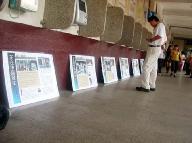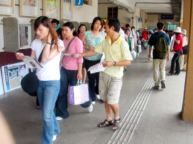 一开始,学员就很主动的与火车站的站长联系,表明我们的目地与这件事的意义,站长欣然同意我们在最醒目的位置征签---车站的出口。学员于周围放置图片,展示江氏集团用以迫害法轮功的十多种惨无人道酷刑,同时还挂上“法轮大法好,世界需要真善忍”的醒目横幅。一群群的人在看到酷刑图片时,露出震惊、惊讶的表情,完全无法想像在今天还有这样的事情发生。法轮功学员则藉这个机会说明真象。