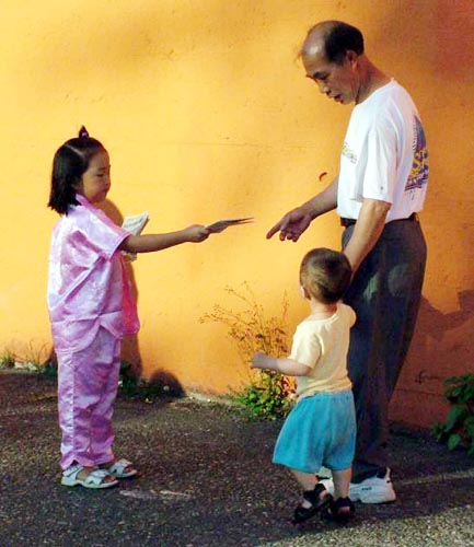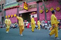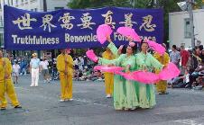 在身着七彩唐装的女学员的舞蹈中,在炼功队整齐的功法表演中,在粉色的扇子舞蹈队的传统中国扇子舞表演中,在优美动人的音乐中,人们感受到了大法的美好。许许多多的华人和西方人频频向法轮功学员招手、点头致意、欢呼、索取大法材料。我们4岁的小弟子也跟着成人学员向人们认真的递上资料。我们感到,更多的华人已通过各种渠道了解大法的真象,从他们的表情上我们可以感受到他们对大法的欢迎和尊敬。