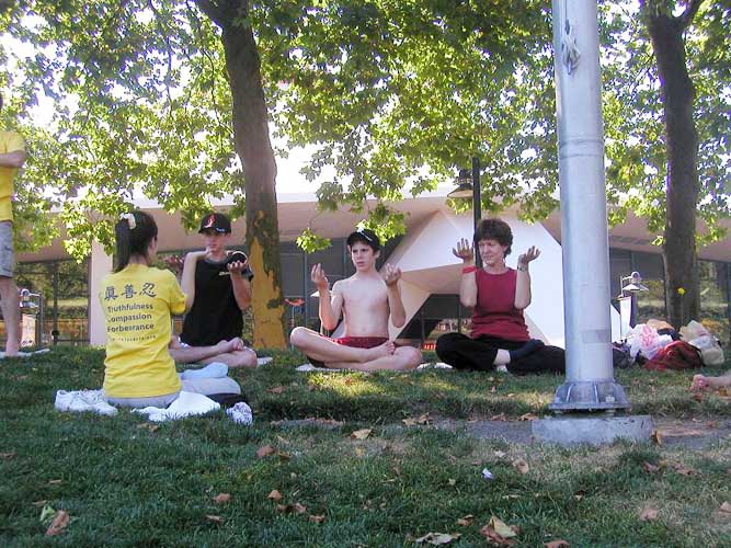 ![]() 在西雅图中心草坪上炼功 | ![]() 来自以色列的母子学炼功法 |