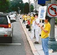 超过三千名法轮功学员23日在首府华盛顿的康乃狄克大道身着黄衫、手持“真善忍”及反迫害标语、图片,排成长达三哩的“勇气长城”,终点是中国驻美使馆前的天安门纪念公园。康乃狄克大道是首府出城要道之一,从市中心到杜邦圆环,一路吸引过往民众及驾驶人的注意。