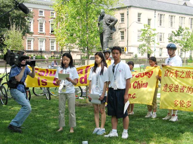 加拿大明慧学校的法轮大法小弟子看到在这场残酷的迫害中,千千万万的孩子也成了江泽民集团恐怖主义暴行的受害者,他们心里十分难过,很希望能够做些什么来帮助那里的孩子们。今天小弟子们终于自己组织发起了这个自行车之旅,也是小弟子们为实现帮助大陆孩子们迈出的第一步。在一个17岁的小弟子凯文。库(Kevin Koo)的建议下,他们自发的发起了“营救中国受迫害的孩子”自行车之旅,决定利用这个暑期的时间,骑自行车从多伦多到华盛顿,并计划在7月20日之前,也就是邪恶镇压发生后的第五年抵达华盛顿。凯文说,“修炼法轮功的孩子们被中国警察用残暴手段折磨的故事使我真正动心而且更加努力的去完成这个自行车之旅。”
