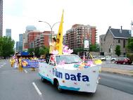 整个游行过程中,学员一直通过音响用英、法文介绍法轮大法的真象。散发资料的学员更是忙得不可开交,有些观众不仅拿一份,还主动为朋友带上几份。其中有许多中国人,打破了以往因受谎言宣传而不敢接受资料的局面。到后来英、法文资料发完后,许多西人甚至索要中文资料,并表示通过查看上面提供的网址,以了解法轮功的内容。