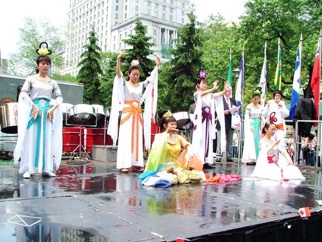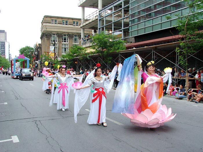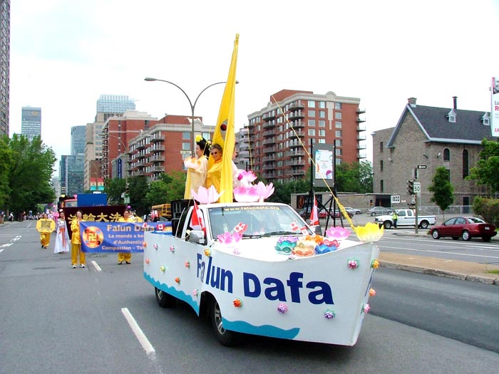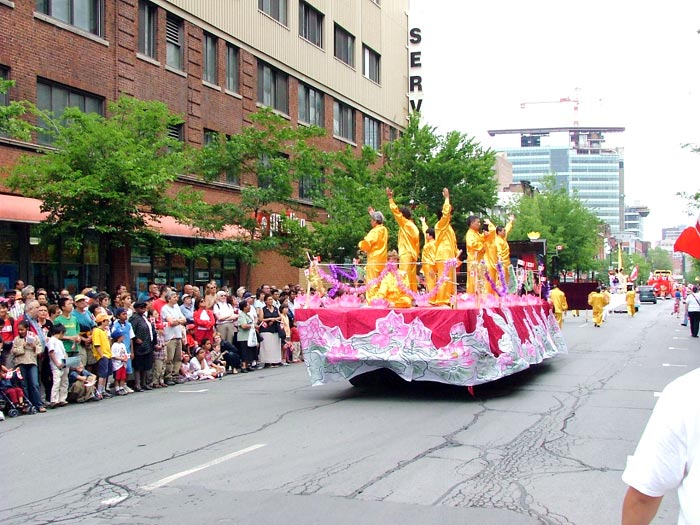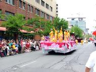 接下来的是红色绒布上绣着“法轮大法”的金字牌匾和大型《转法轮》模型。随后是一辆大型彩车,上面身穿炼功服的8名法轮功学员连续的展示五套功法,一路受到观众的掌声欢迎。当学员合十时,许多观众则恭敬的鞠躬回应。彩车后面是法轮功学员的舞蹈队伍,手持莲花的学员优雅的舞姿为庆祝活动更添喜庆。最后是明慧学校的队伍,小弟子有的穿着胸前绣有法轮图形的服装,有的穿着印有“法轮大法”字样的黄T恤,一直跟着队伍走完全程。