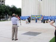 法轮功学员们不仅打出“法轮大法”“真善忍”的横幅,而且赶制了“强烈谴责江氏集团海外雇凶杀人的恐怖主义行径”的大型中英文横幅,表达他们对法轮功学员在南非遭枪击事件的极大关注。