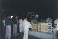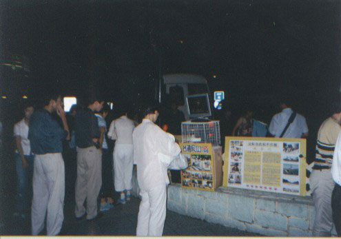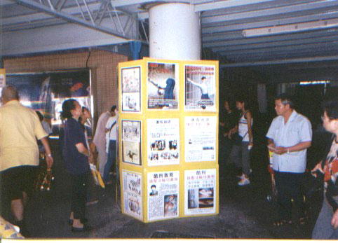 我们来到这里,几位同修先找到一块空地,坐下来发正念半小时,紧接着分开来讲真象。由于这地方空间不大,大陆游客又多,密密麻麻的人群非常拥挤。当我跟其中一位游客讲真象时,旁边的游客也同时可以听到,真有一传十、十传百的感觉。香港同修在当地播放真象影片并且摆放有关迫害真象的图片,大陆同胞一面观看影片及图片,同时可以听到我们诉说迫害真象,效果非常好。我告诉他们法轮功不参与政治,江××集团如何迫害大法及大法学员,“天安门自焚”案是造假的,大法洪传海外六十几个国家,在海外可是褒奖连连呢!海外没听说有发生“自焚案”,惟独中国大陆有;海外也没有禁止炼法轮功,惟独中国大陆在禁止。请大家用智慧冷静思考,我们的政府到底怎么了?