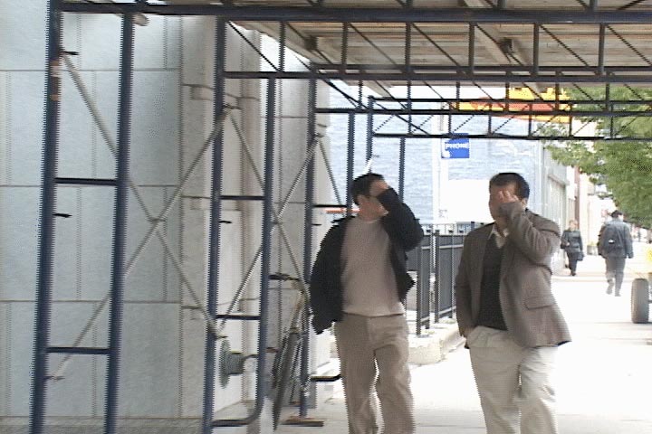 ![]() 2001年9月7日打人者郑积明(右)在马路上向方霖冲来,翁玉俊(左,车内)推车门冲出。 | ![]() 2002在8月27日郑积明(右) 和Kwok, Sing-chok(左)在進法庭时遮脸回避拍照。 |