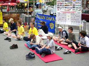 一些人停下来饶有兴趣的阅读展板上有关法轮功的特点和卍字符涵义的介绍,他们还看了一些在中国受到残酷迫害的法轮功学员的图片。许多人观看了伴有祥和音乐的平和的动功和静功功法。