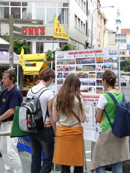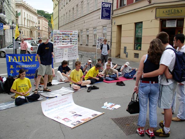 世界反酷刑日是一个很好的机会向布尔诺市市民说明在中国发生的骇人听闻的迫害,而这些受迫害的人们是把善良的最本质特性真、善、忍引入其日常生活和周围环境的人们。学员们在主要大街塞斯克(Ceska)街道上演示法轮功功法,并唤起公众关注在中国发生的对法轮功学员的恐怖迫害。