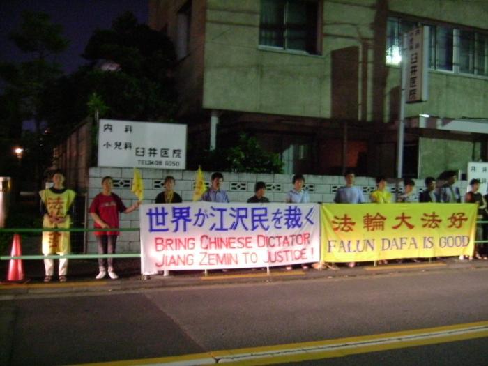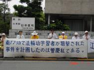 【明慧网2004年7月4日】获悉澳洲法轮功学员在南非遭枪击的消息,日本法轮功学员于2004年6月29日中午就前往驻日中国大使馆,对“江泽民流氓集团的恐怖行为”表示强烈谴责。学员们打出“法轮大法好” 和“全球公审江泽民”的横幅面向大使馆,直到当晚10点。6月30日亦打出“曾庆红在南非雇凶枪击法轮功学员”的横幅,当天并有来自澳洲的法轮功学员一起参与请愿。7月1日学员们继续请愿,强烈谴责江泽民流氓集团的恐怖行径。