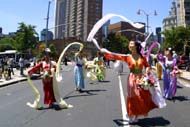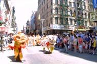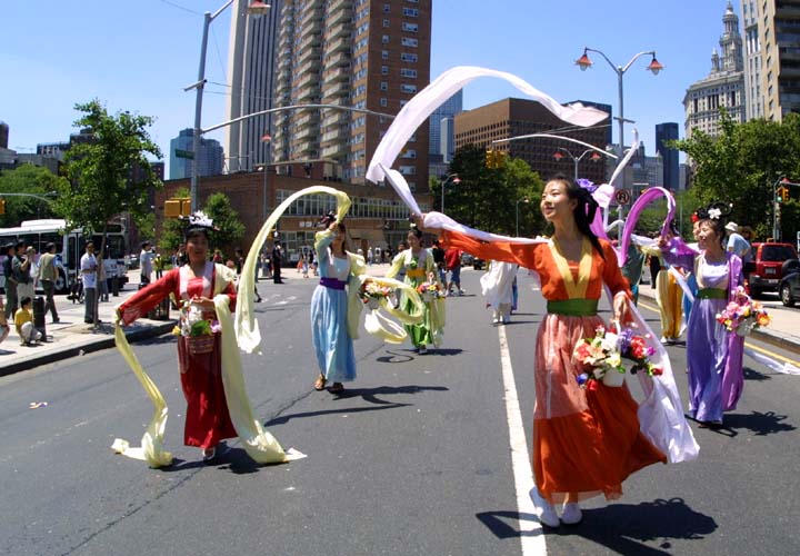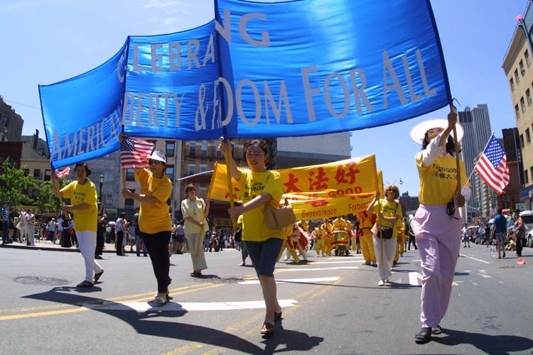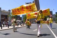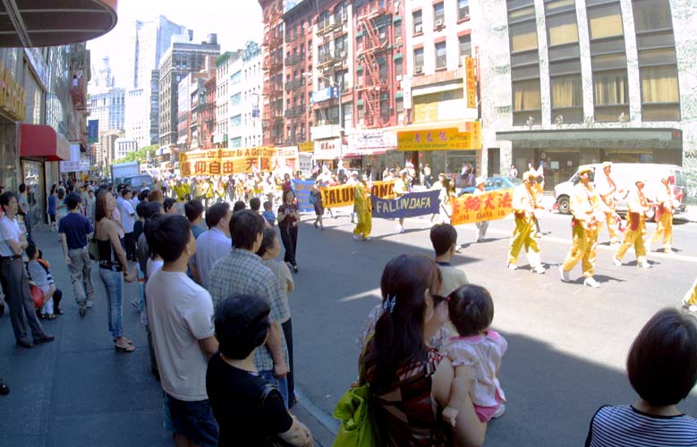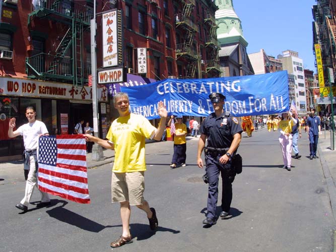 【明慧网2004年7月4日】2004年7月3日,法轮功学员顺利参加了在纽约曼哈顿华埠举行的庆祝美国独立日的华人大游行,社区里的民众高兴的欣赏着美好的一切,欢乐写在脸上。这是法轮功学员在纽约华埠第一次和其他华人团体一起游行庆祝美国独立日。游行的组织者一直回避法轮功学员的正式申请,大纽约地区的学员对此事進行了大量的学法交流,纽约的政府官员、媒体、监督机构和民众对此事表示了极大的关注,最终在游行当天法轮功学员顺利的参加了游行,表现非常出色。