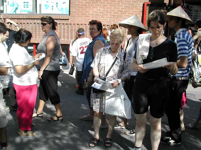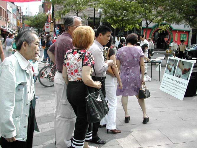 法轮功学员阿里森说:“所有的人都很友好,中国人也一样,他们静静的看,然后拿走真象材料。”特翰女士则说:“看到邪恶雇凶杀害法轮功学员,中国人拿资料的比以往任何时候都多。”
