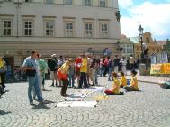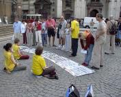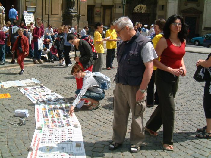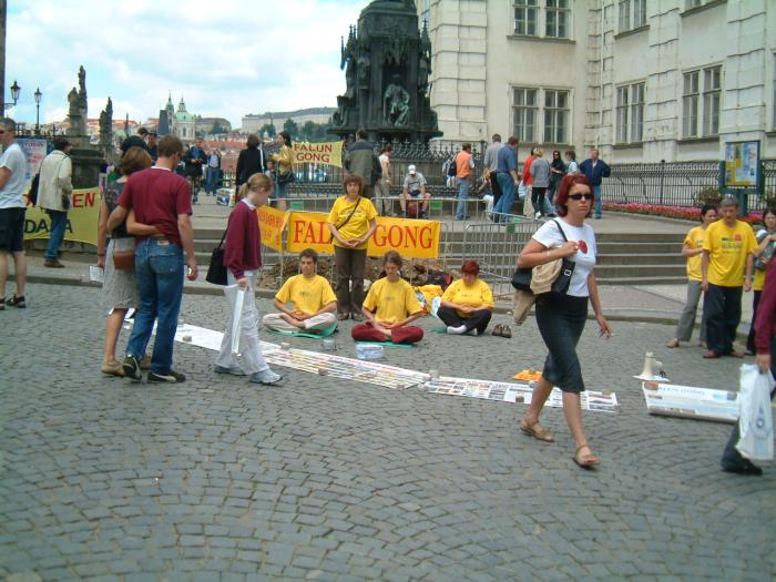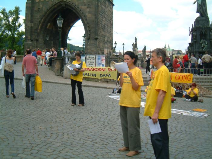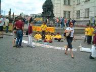 大约早上11点半,克瑞佐尼克广场上回响着宣读两位国会议员和一位参议员写给法轮功学员表示对这次新闻发布会支持和祝愿信件的声音。这些祝愿和支持连同奥林匹克观察委员会秘书宣读的参议员儒姆尔(Ruml)的声明,给那些在江集团高压及残酷暴行下坚持不放弃信仰的被监禁者,以及给那些甚至此时此刻正在中国监狱和劳教所遭受折磨的人们,带来希望之光。