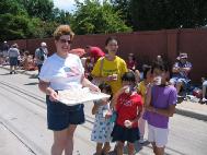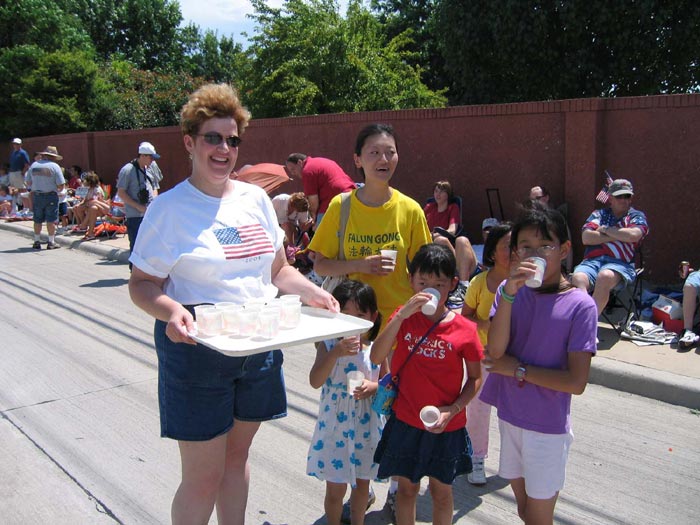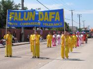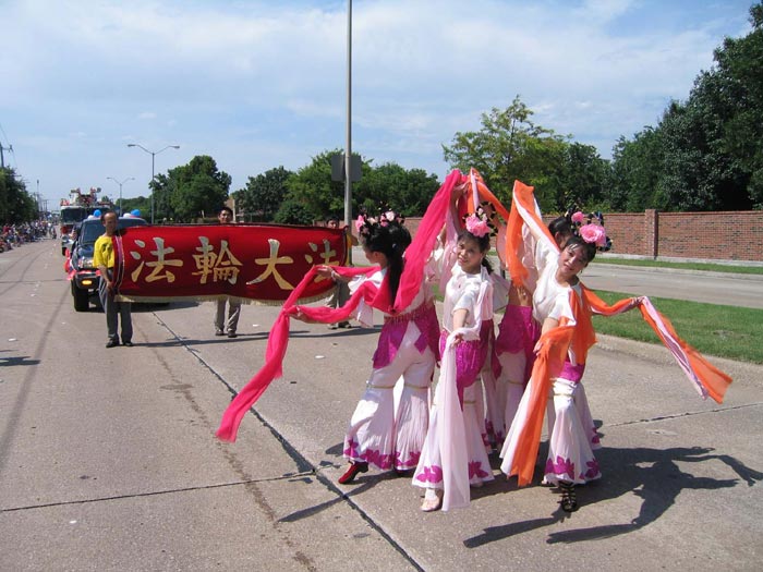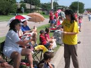 游行的队伍从布兰诺市的高中出发沿着独立大道一直到Spring Creek Parkway上的伊丽莎白-安-塞顿教堂结束,尽管天气非常的炎热,但全体学员都非常保持精神饱满的状态,举着中英文“法轮大法”横幅的男学员大步向前,身着炼功服的几位学员认真的演示着五套功法,六位女学员轻舞彩带,伴着“法轮大法好”的音乐翩翩起舞。整个队伍令人赏心悦目,观看的人群对他们报以热烈的掌声,高兴的接过学员们递过来的传单想了解什么是法轮大法。几位明慧学校的小弟子向人们发送着大法资料,坚持走完两英里多的全程,学员们准备的2000多份资料全部被发完。
