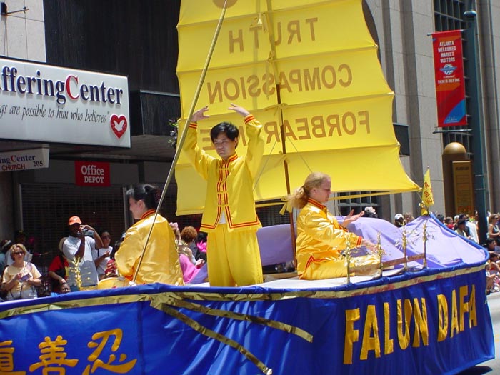 亚特兰大华人社区的一位中国人在电视机前看到这一幕后, 激动的给法轮功学员打电话说“法轮功真是太棒了!我们为你们感到骄傲!”