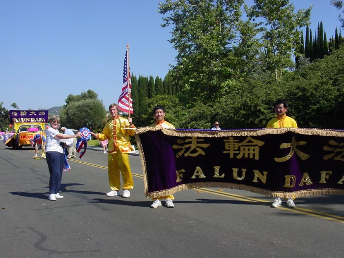 【明慧网2004年7月8日】2004年7月4日,圣地亚哥的法轮功学员继上午参加了洛杉矶亨廷顿滩(Huntington Beach)第100届国庆游行以及当地的斯克里普司牧场(Scripps Ranch )国庆日游行后。又马不停蹄来到圣地亚哥北区的伯纳多牧场(Rancho Bernardo)与当地民众共庆国庆。