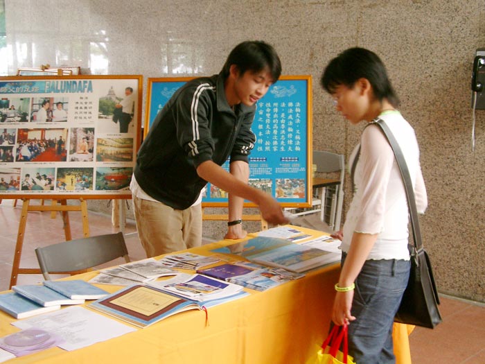 学员向同学介绍法轮大法另外还有位本校学生访问大陆大学时,受到中国大陆媒体污蔑法轮功的谎言所蒙蔽,回来后向本校学生灌输大陆官方谎言,本校学生就向他们讲大法洪传世界等等他所认识的真象。然而这位学生也还有不很清楚真象的地方,所以这次跑来展位寻找答案,最后他了解了“真善忍”的法理带给人们的美好以及大陆的各种不实谎言,并带了许多真象材料与回去了解。不时也有人来问大陆法轮功遭的真象。