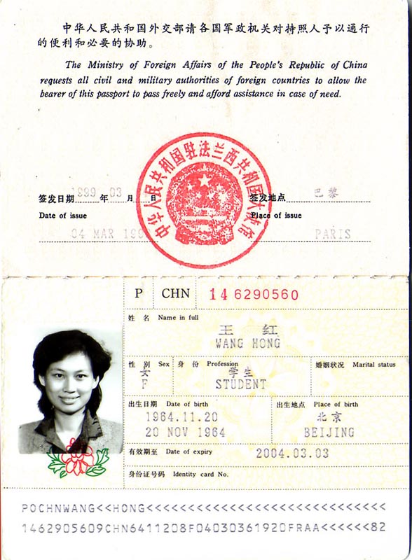 ![]() 王红的护照 | ![]() 办理更换的收据 |