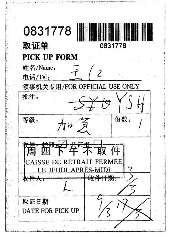 后来我到取件的窗口,我把收据递進去,窗口的人说,“我这没有,谁给你办的找谁去。”我问她,“那您从这个单子上看得出来是谁办的吗?”她脱口而出:“刘秘书!”可见刚才那个领馆接待人员撒谎张口即来。