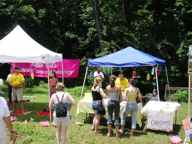 今年法轮功的展位由四部分组成:功法表演、手工制作、大法洪传图片展和迫害真象。学员精心手工制作的莲花及小风车格外惹人喜爱,很多儿童流连忘返,学员在教授孩子们作手工的同时,给家长们進一步讲清了真象。